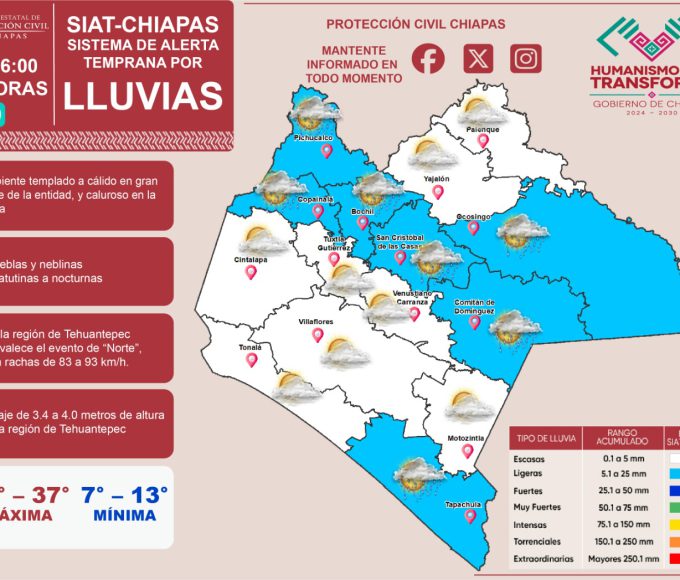 By Redacciónenero 20, 2026📢 ¡Atención #Chiapas! 📢 Hoy, 20 de enero del 2026, el Sistema de Alerta Temprana por #Lluvias (#SIAT) de #ProtecciónCivil Chiapas emite el...