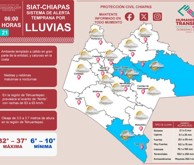 By Redacciónenero 21, 2026📢 ¡Atención #Chiapas! 📢 Hoy, 21 de enero del 2026, el Sistema de Alerta Temprana por #Lluvias (#SIAT) de #ProtecciónCivil Chiapas emite el...