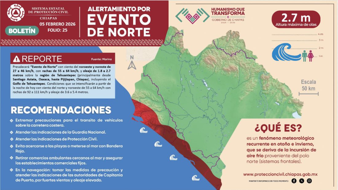 By Redacciónfebrero 5, 2026Tuxtla Gutiérrez, Chiapas; 4 de febrero de 2026.- La Secretaría de Protección Civil de Chiapas informó sobre el ingreso del frente frío No....