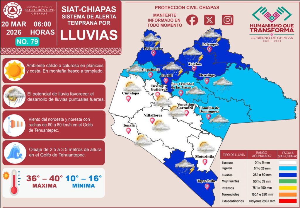 Hoy, 20 de marzo del 2026, el Sistema de Alerta Temprana por #Lluvias (#SIAT) de #ProtecciónCivil Chiapas emite el pronóstico de lluvias en nuestro estado. 🌧⛈