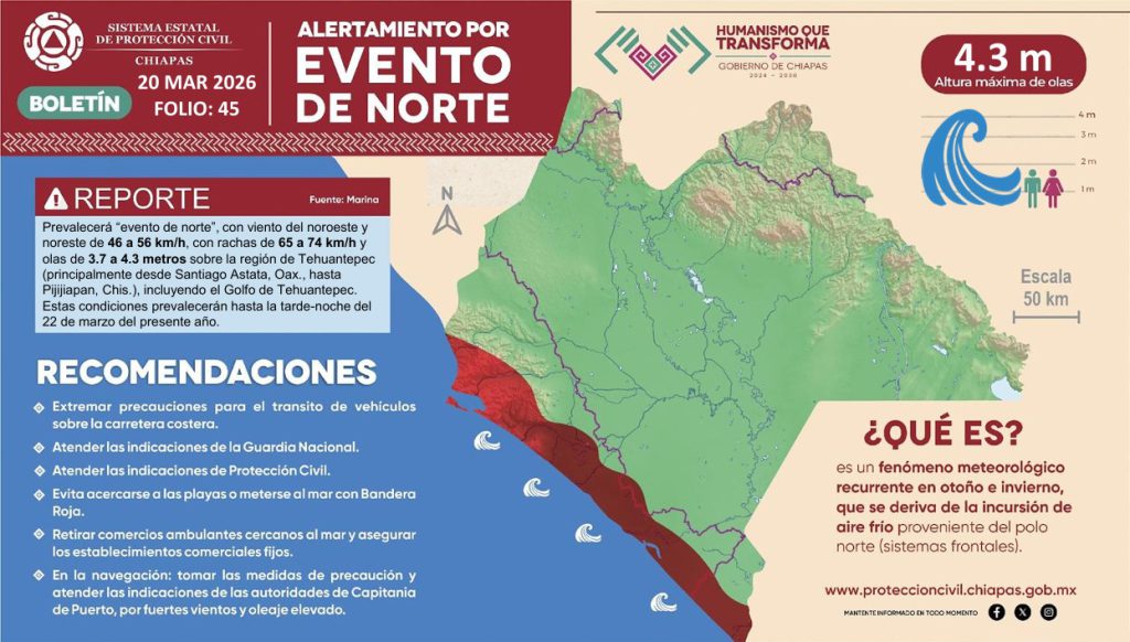 Prevalecerá «Evento de Norte» con rachas de 65 a 74 km/h y oleaje de 3.7 a 4.3 metros sobre la región de Tehuantepec.