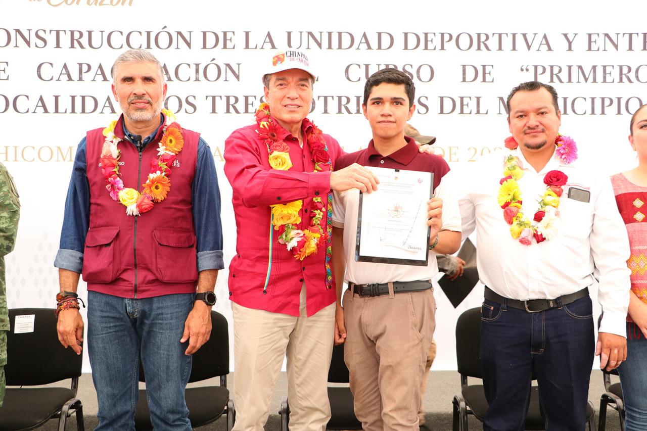 Cabe destacar que en su visita a esta municipio, el gobernador también realizó la entrega de constancias de capacitación del Curso de Primeros Auxilios, impartido por el Instituto de Capacitación y Vinculación Tecnológica de Chiapas (Icatech) a la población, personal de Protección Civil y Seguridad Pública Municipal, donde precisó que estas acciones permiten actuar de manera oportuna ante cualquier situación de emergencia que ponga en riesgo la integridad de las personas.