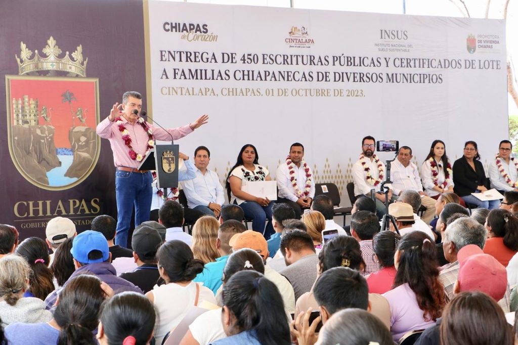 El mandatario explicó que estas acciones son necesarias para que las y los chapanecos estén más fortalecidos en su economía y vivan más tranquilos, por ello, dijo que, en colaboración con los tres órdenes de gobierno, se pasó de 249 escrituras que se entregaron en el sexenio anterior, a 5 mil 600 en lo que va de la actual administración estatal, además, se han regularizado 12 mil lotes agrarios y pronto se entregarán otros mil 500 certificados.
