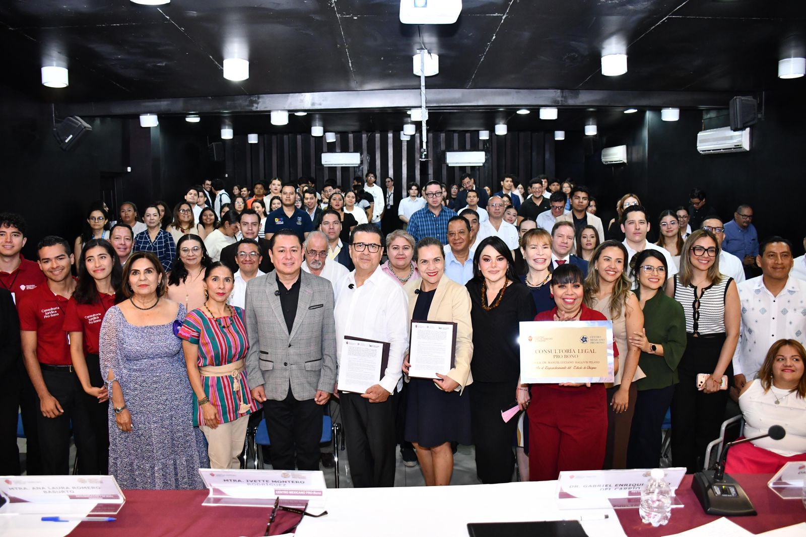 El evento contó con la presencia de autoridades académicas y representantes del ámbito jurídico, entre quienes destacaron Susana Palacios Morales, directora de FLDCH; Ivette Montero Rodríguez, representante legal del Centro Mexicano Pro-Bono; Karla Marena Carranza Ojeda, coordinadora de la Consultoría Legal Pro-Bono; Guillermo Nieto Arreola, consejero jurídico en representación del gobernador del estado, Eduardo Ramírez Aguilar; Fabiola Huerta Salvá, presidenta del Consejo Académico de la FLDCH; así como Jovani Salazar Ruiz, director general de la Agencia Digital Tecnológica del Estado de Chiapas (Aditech).