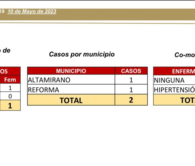 Tuxtla Gutiérrez, Chiapas; 10 de mayo de 2023.- Se reportan dos casos nuevos de COVID-19 en Chiapas, en los municipios de Altamirano y...
