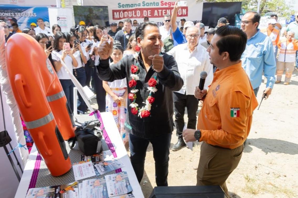 Desde Bahía de Santa Brígida, en el municipio de Arriaga, el Gobernador del Estado, Eduardo Ramírez Aguilar dio el banderazo de salida del Operativo Semana Santa Segura 2026, acompañado del Secretario de Protección Civil, Mauricio Cordero Rodríguez; el Secretario de Salud, Dr. Omar Gómez Cruz; el Secretario de Seguridad del Pueblo, Óscar Alberto Aparicio Avendaño y funcionarios de los tres órdenes de Gobierno.