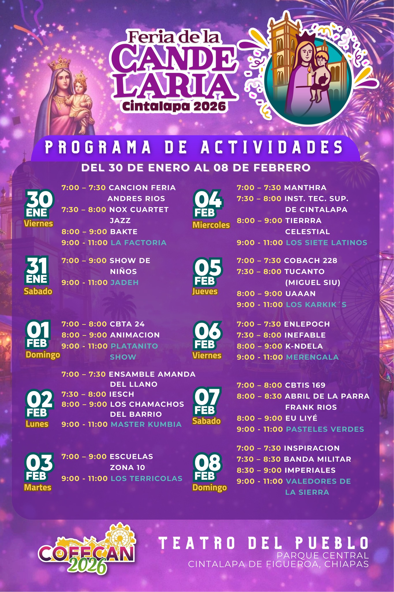 El Comité de Feria de la Candelaria 2026 te invita a disfrutar de una gran variedad de espectáculos, música, talento local y regional del 30 de enero al 8 de febrero en el Teatro del Pueblo, dentro de nuestra tradicional feria.