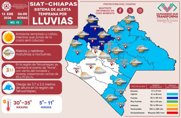 By Redacciónenero 13, 2026📢 ¡Atención #Chiapas! 📢 Hoy, 13 de enero del 2026, el Sistema de Alerta Temprana por #Lluvias (#SIAT) de #ProtecciónCivil Chiapas emite el...