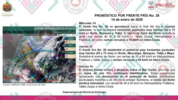 By Redacciónenero 14, 2026Frente Frío No. 28 El sistema frontal se aproximará la noche de este miércoles al sureste del país, favoreciendo tormentas muy fuertes en...