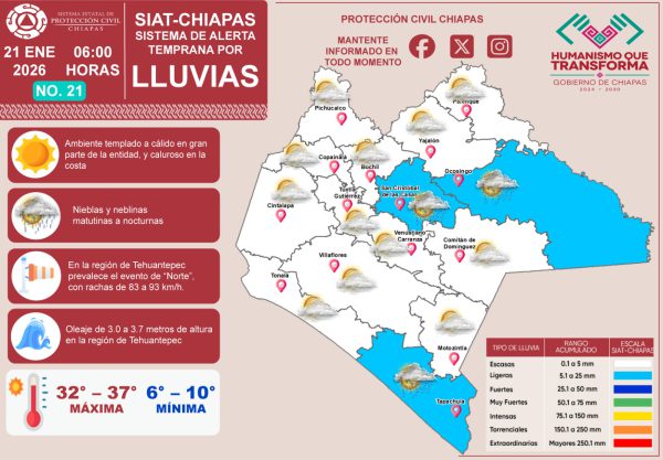 By Redacciónenero 21, 2026📢 ¡Atención #Chiapas! 📢 Hoy, 21 de enero del 2026, el Sistema de Alerta Temprana por #Lluvias (#SIAT) de #ProtecciónCivil Chiapas emite el...