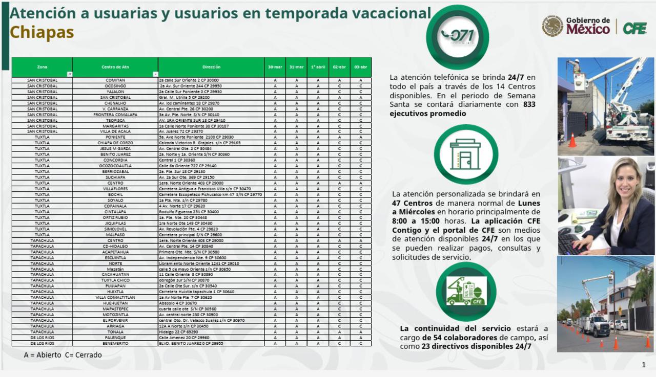 En este sentido, la CFE informa que los módulos de atención operan de 8:00 a 15:00 horas, de lunes a miércoles, y que se mantiene disponible la atención las 24 horas a través de la línea telefónica 071, la aplicación CFE Contigo y el portal http://cfe.gob.mx.