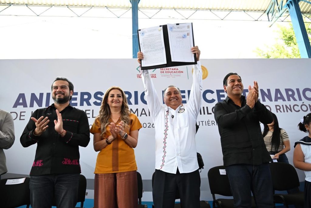 Por su parte, el secretario de Educación, Roger Mandujano Ayala, resaltó que esta institución se distingue por su capacidad de innovación y su contribución al sistema educativo en Chiapas. Informó que se impulsarán acciones para fortalecer su carácter como escuela prototipo en innovación e inclusión educativa, entre ellas la incorporación de la Unidad de Servicios de Apoyo a la Educación Regular, la entrega de pizarrones digitales, la capacitación docente y la dotación de libros de autores chiapanecos.