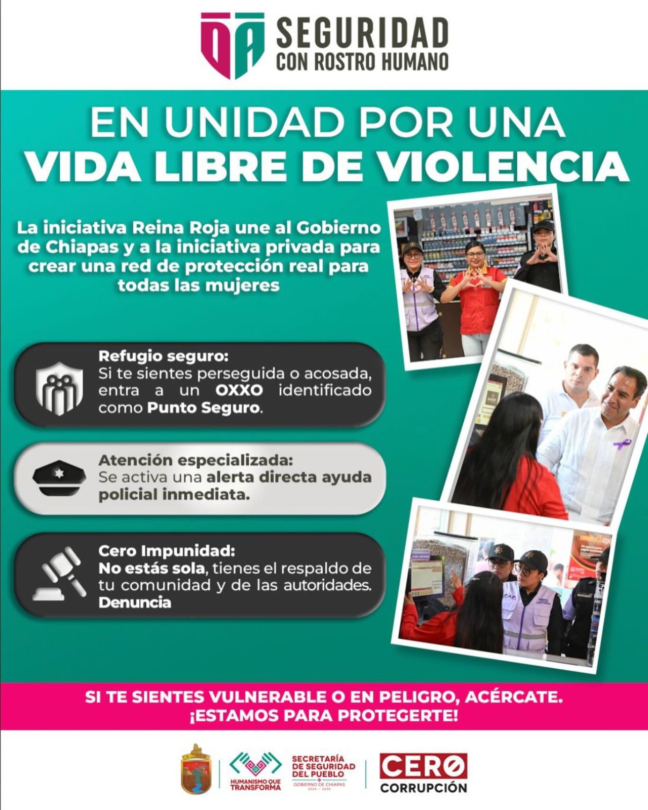 En fortalecimiento a las políticas de atención de la violencia de género y la protección de las víctimas que impulsa el gobernador del estado, Eduardo Ramírez Aguilar, la SSP trabaja en coordinación directa y estrecha con los establecimientos de la cadena comercial OXXO, S.A. de C.V., que cuentan con Puntos Seguros para brindar una asistencia inmediata a las mujeres que se sientan vulnerables o en peligro.