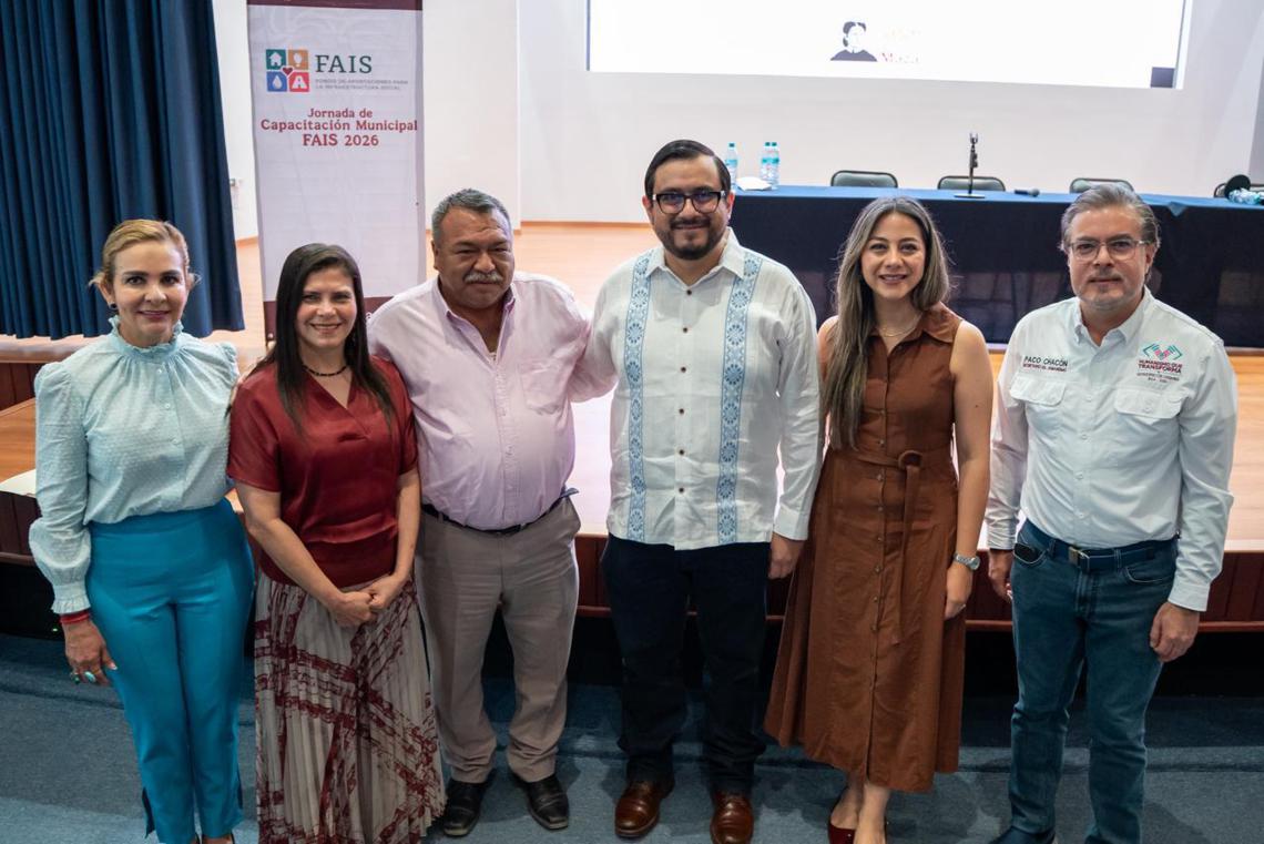 Tuxtla Gutiérrez, Chiapas; 27 de febrero de 2026.- La presidenta y rectora del Instituto de Administración Pública del Estado de Chiapas (IAP Chiapas), Lysette Raquel Lameiro Camacho, acompañó al director general de Desarrollo Regional de la Secretaría del Bienestar, José Antonio Aguilar Castillejos, así como de la delegada de los Programas del Bienestar para el Desarrollo en el Estado, Manuela Obrador Narváez, al titular de la Secretaría del Humanismo, Francisco Chacón, y a la presidenta del Congreso del Estado, Alejandra Gómez Mendoza, quienes estuvieron presentes en la Jornada de Capacitación Municipal FAIS 2026, con el objetivo de fortalecer la correcta aplicación de los recursos y la gestión municipal.