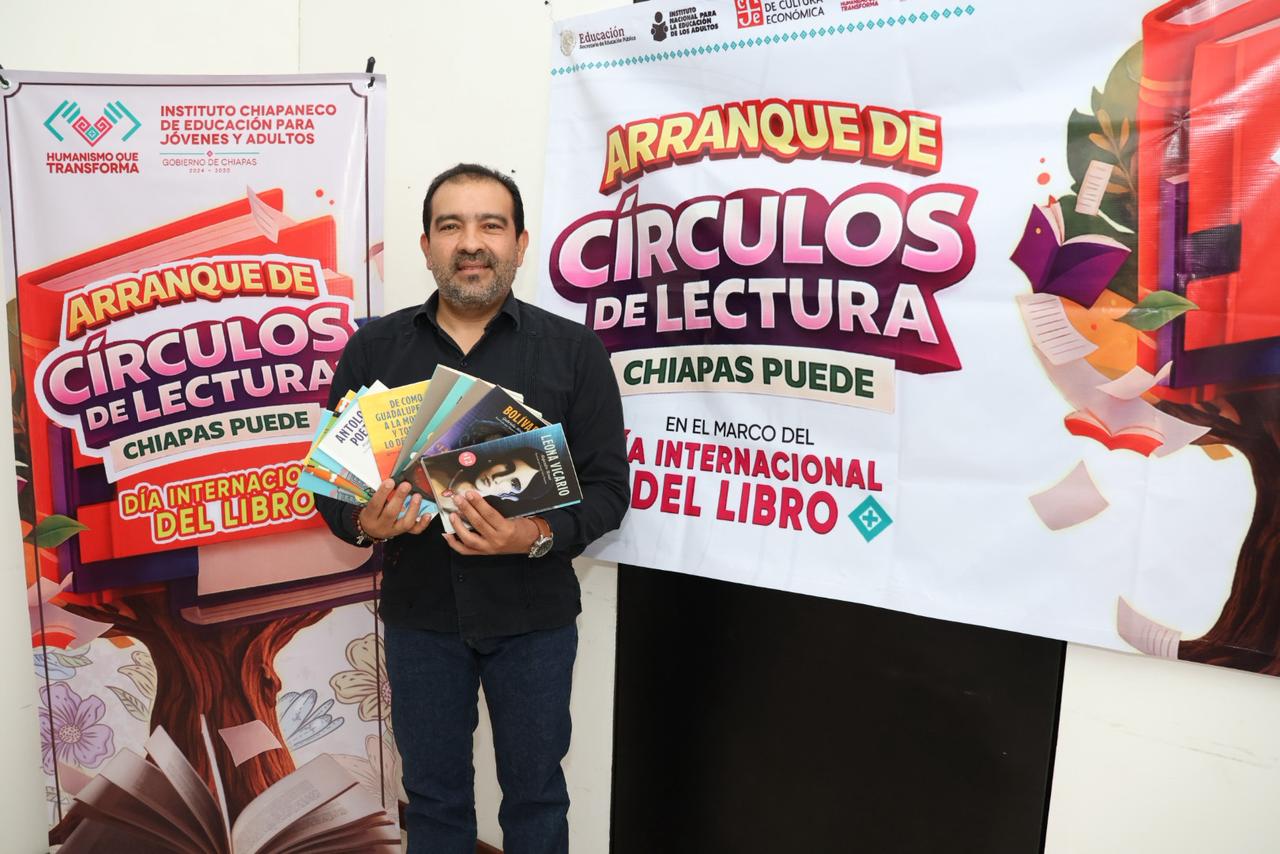 Tuxtla Gutiérrez, Chiapas.- En el marco del Día Internacional del Libro, el director general del Instituto Chiapaneco de Educación para Jóvenes y Adultos (Icheja), Sergio David Molina Gómez, encabezó en las tres coordinaciones regionales y las 23 coordinaciones de zona a distancia y de forma virtual, el arranque de la estrategia Círculos de Lectura “Una Misma Historia: Chiapas Puede”, orientada a dar continuidad a la formación de personas alfabetizadas durante 2025.
