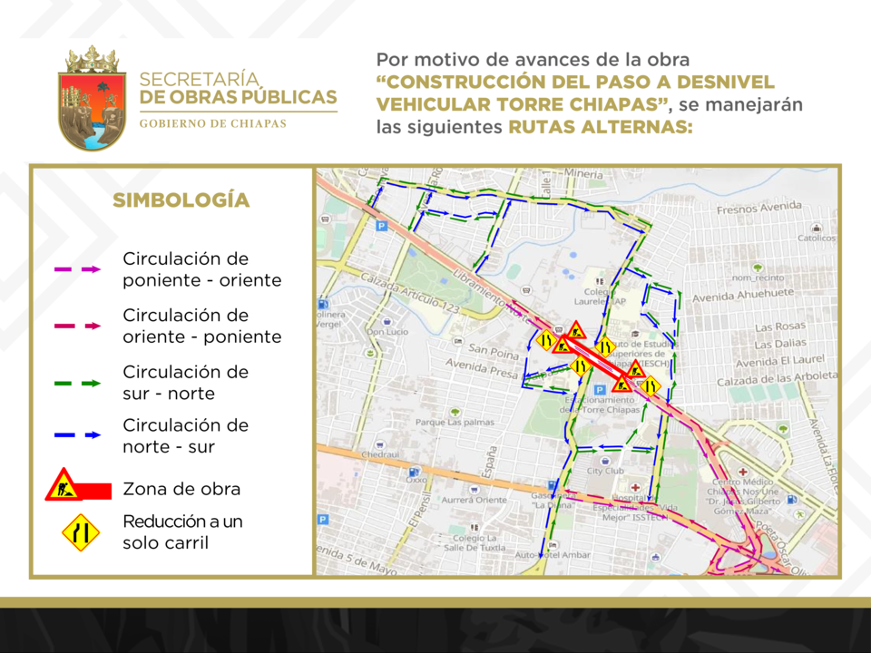 La Secretaría de Obras Públicas del Estado, a cargo de Ángel Torres, informó que se reducirá la circulación vehicular, de norte a sur y de oriente a poniente, es decir, no habrá cierre total, sino que se limitará el tránsito en la medida que la obra lo permita, durante la construcción del Paso a Desnivel del crucero de la Torre Chiapas, donde este domingo 29 de enero se pondrá la primera piedra para iniciar los trabajos.