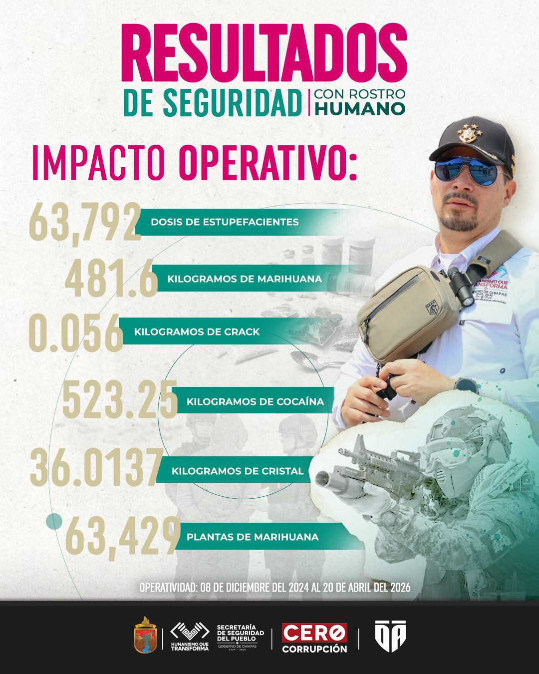 Tuxtla Gutiérrez, Chiapas; 21 de abril 2026.- La Secretaría de Seguridad del Pueblo (SSP), que encabeza Óscar Alberto Aparicio Avendaño, durante operativos interinstitucionales realizados desde el inicio de la Nueva ERA, en diciembre de 2024, a la fecha, ha logrado resultados firmes y contundentes en materia de aseguramiento de narcóticos en todo el territorio chiapaneco.