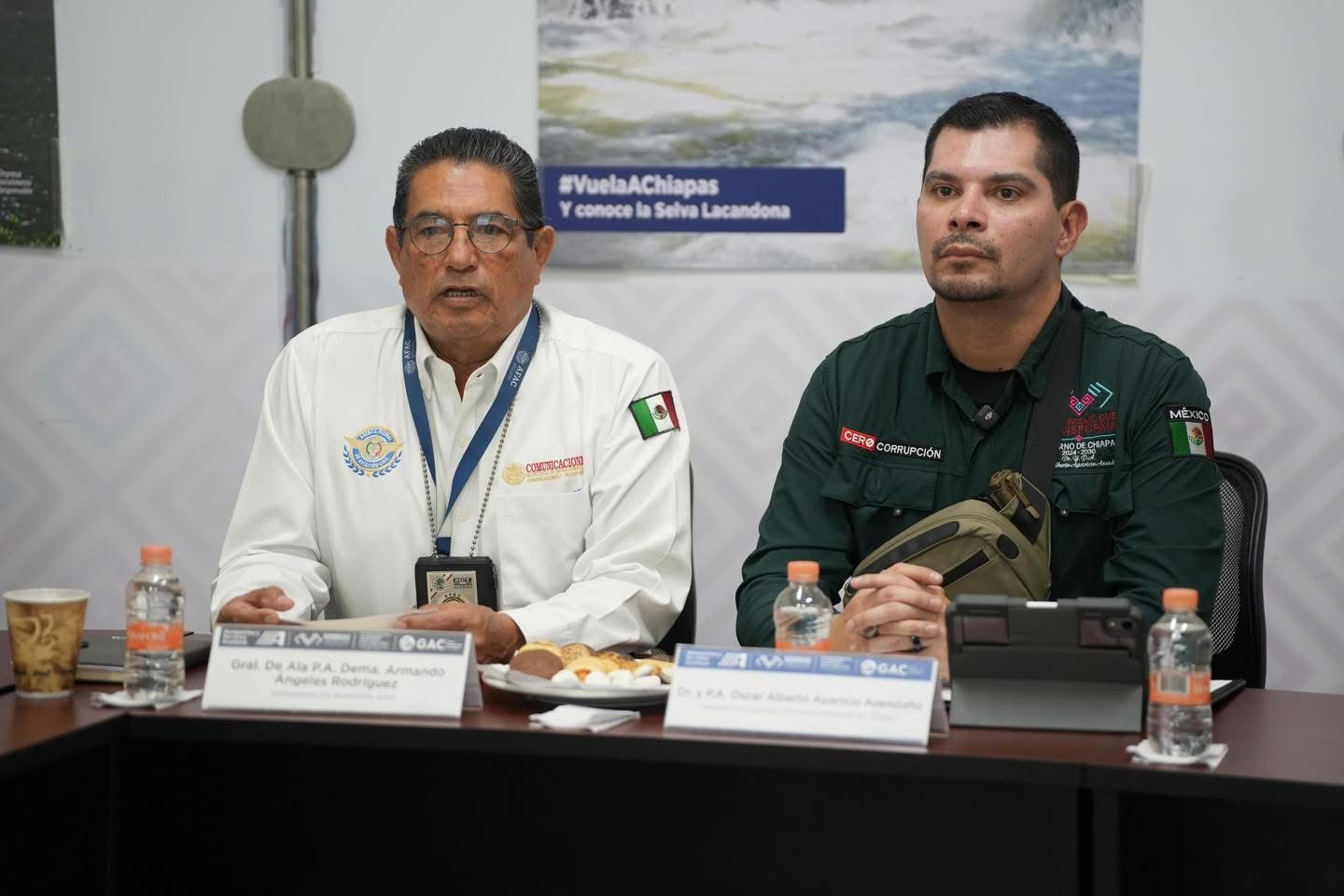 Acompañado del comandante del Aeropuerto Internacional “Ángel Albino Corzo”, Armando Ángeles Rodríguez, y el comandante de la Base Aérea Militar número 6, Cleofas Valenciano Romero; así como de representantes de instituciones federales y estatales, Aparicio Avendaño destacó que con la visión del gobernador Eduardo Ramírez Aguilar, hoy se trabaja en unidad y coordinación para reforzar estrategias preventivas y disuasivas, tanto en el interior como exterior del aeródromo.