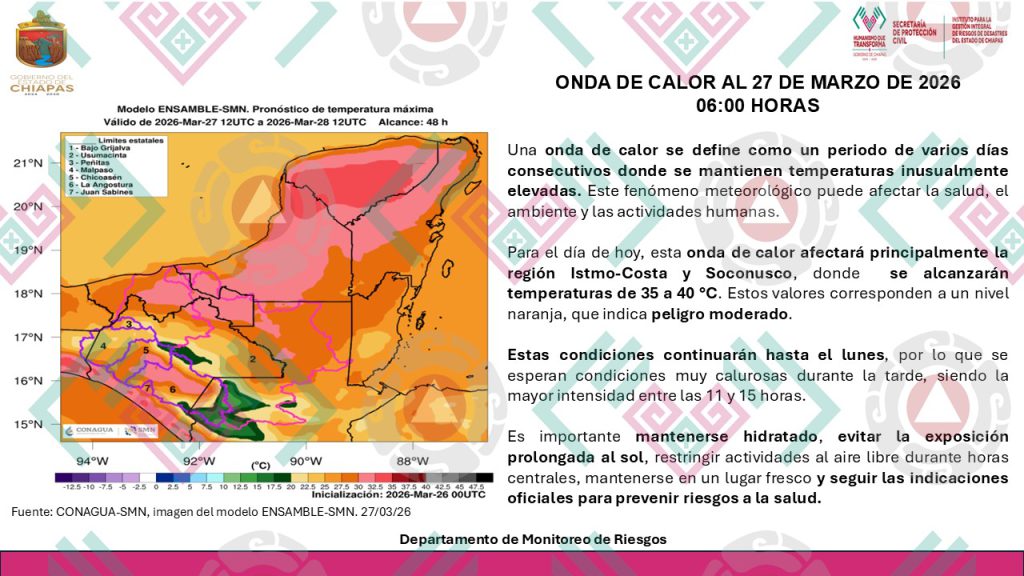 Las regiones Istmo-Costa y Soconusco registrarán temperaturas máximas de entre 35 y 40 °C. Estas condiciones persistirán, al menos, hasta el próximo lunes. ☀️