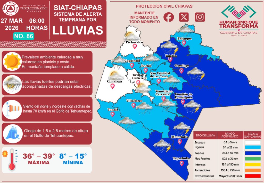 Hoy, 27 de marzo del 2026, el Sistema de Alerta Temprana por #Lluvias (#SIAT) de #ProtecciónCivil Chiapas emite el pronóstico de lluvias en nuestro estado. 🌧⛈