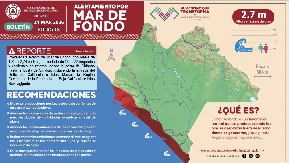 Prevalecerá el evento «Mar de Fondo» que causará oleaje de 1.82 a 2.74 metros en la costa del estado.