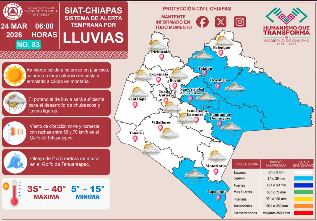 Hoy, 24 de marzo del 2026, el Sistema de Alerta Temprana por #Lluvias (#SIAT) de #ProtecciónCivil Chiapas emite el pronóstico de lluvias en nuestro estado. 🌧⛈